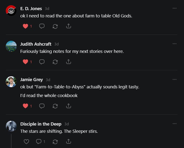 “Farm-to-Table-to-Abyss: Fresh Offerings for Old Gods.”