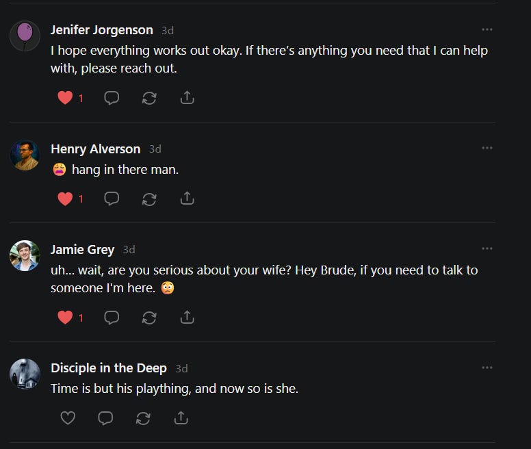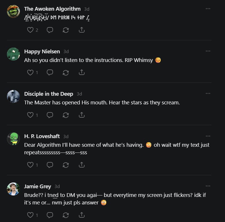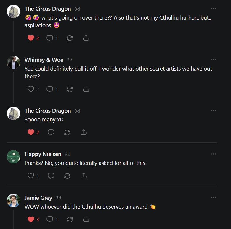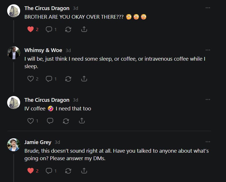 This is an experimental story originally done completely in Substack notes and comments from my friends. I am trying to gather it all into a readable post form. Hopefully you enjoy it.